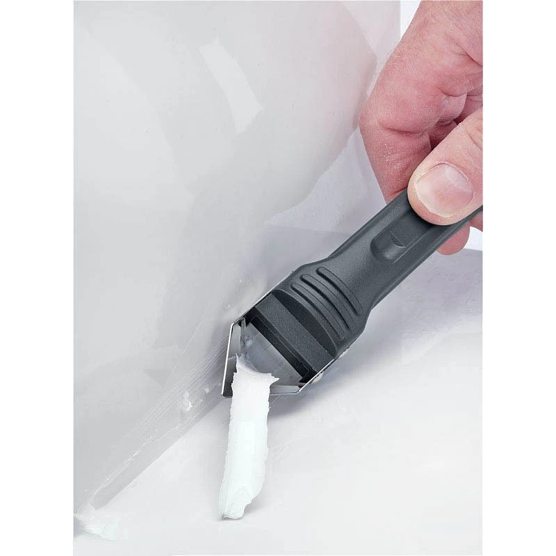 - Manufactured from durable plastic with stainless steel blade, three blades allow the user to remove silicone with push, pull and scrape motion.