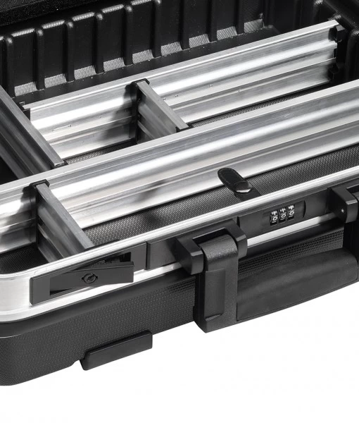 - A robust aluminum frame with hem protections to protect the tools in the case 2 lockable cliplocks plus one B&W PROFI code combination lock ensure security