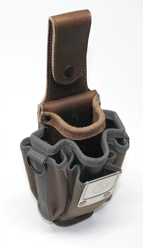 The MP1 is a compact tool pouch with a leather ”Pocket Pad” to slip into your back pocket for a quick and easy carry of tool storage. It also has a ”Fold-Over” leather belt loop with snap for a more permanent connection and comes with a stainless steel metal tape measure clip.