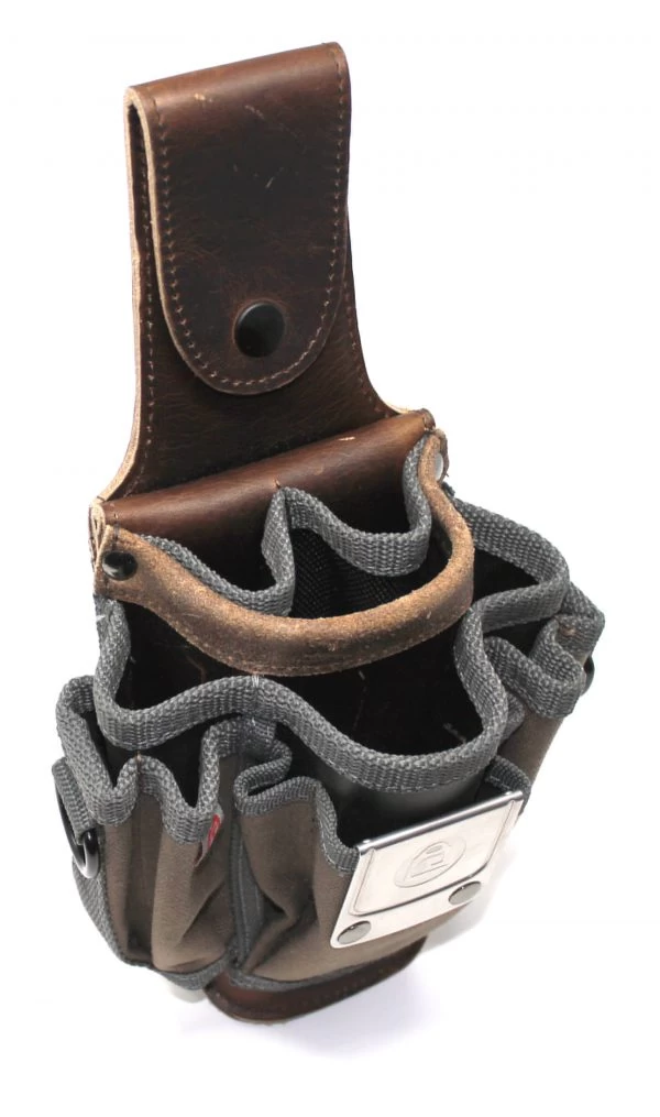Similar to the MP1, the MP2 leather tool pouch is the same functional combination of the leather for the main body and 1200 denier polyester fabric tool pockets…but a bit larger. Also, sporting a ”flush mount” stainless steel tape measure clip. And it offers the same quick and easy tool storage.