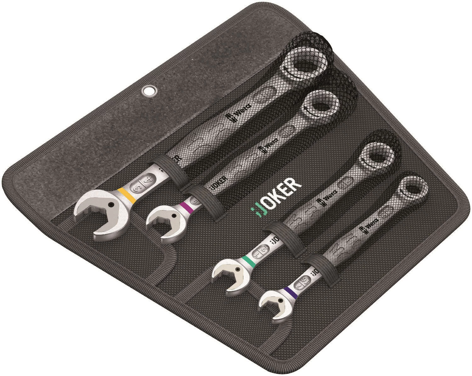 High quality combination ratchet wrench set by Wera: everything that a wrench has to be able to do. And a whole lot more. Faster, better, stylish. Yes, a real Joker. The new generation of combination ratchet wrenches. 4-piece set with imperial sizes in a robust pouch. Suitable for hexagon bolt heads or nuts. Comes with a holding function, thanks to the metal plate in the jaw, which reduces the risk of dropping nuts and bolts.