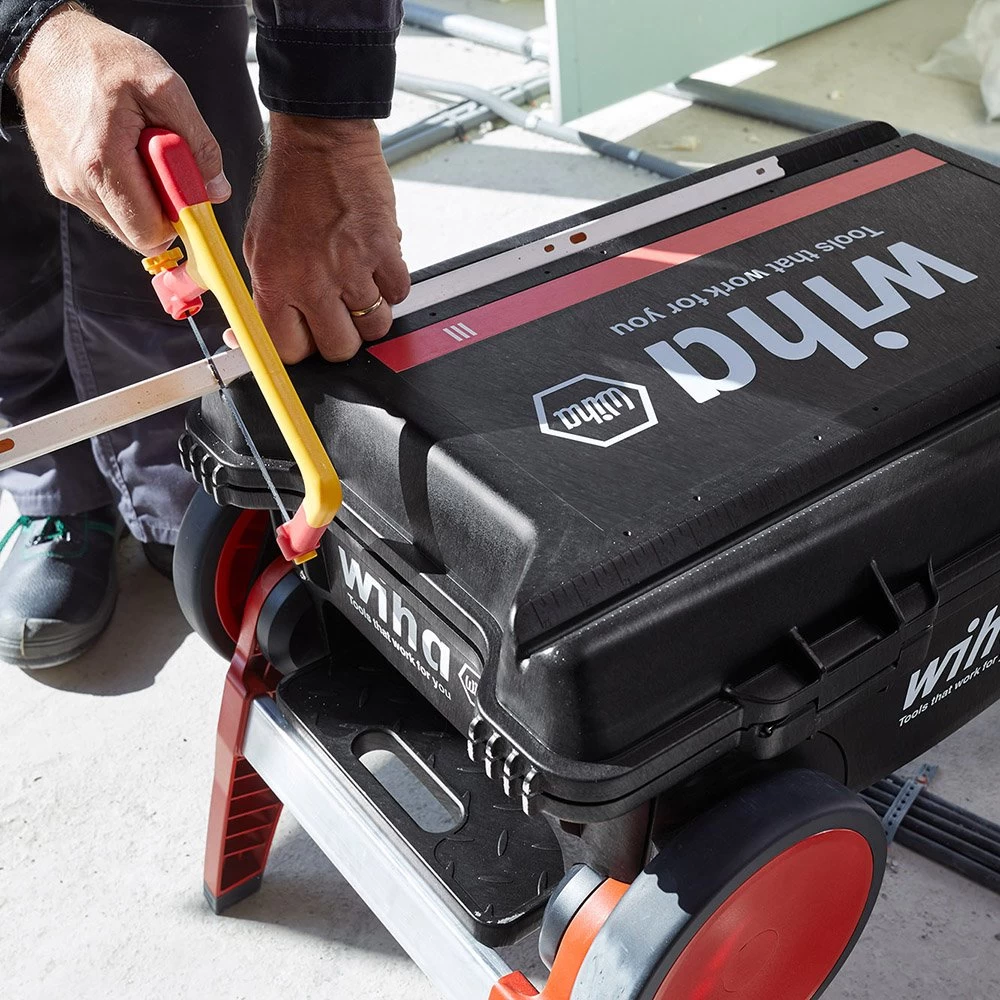 The case serves as a mobile workbench and simplifies working. The guide rails (V-groove) with scales (metric and imperial) in the case lid make it easier to cut materials such as cable pipes and ducts to size.