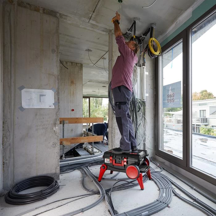 Thanks to the extra large wheels, it is easy to pull the case behind you on rough terrain or over stairs. Thanks to the fold-out legs, the case also serves as a non-slip step. In addition, the elevated position makes it comfortable to take out the tools, which is easy on the back.